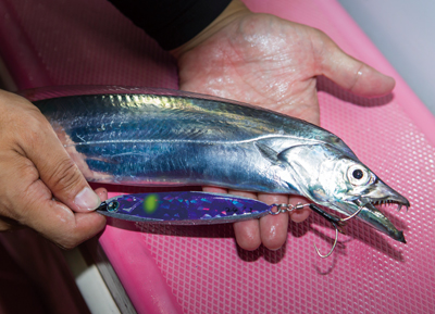 浅いレンジを攻めるだけに、ジギングでは、いかに食わせの間となるフォールや、ときにはステイを演出するかがカギになるそうだ。